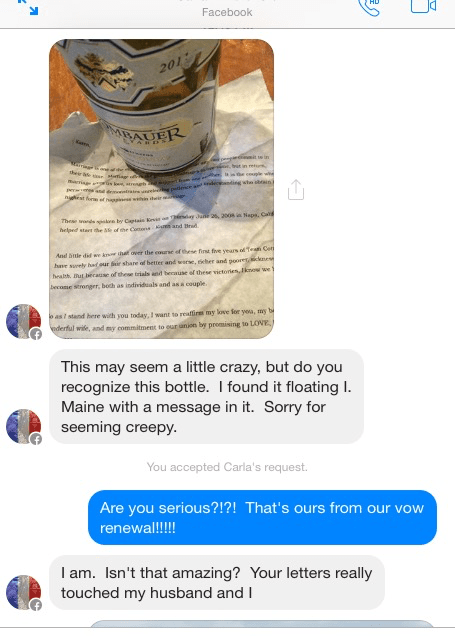 Wait for it……Just yesterday, my parents 60th wedding anniversary, my husband and I just received the most amazing gift – a woman in Maine messaged me that she and her husband were out lobstering last year and found our message in a bottle. She said our love story really touched them and thanked us for sharing.